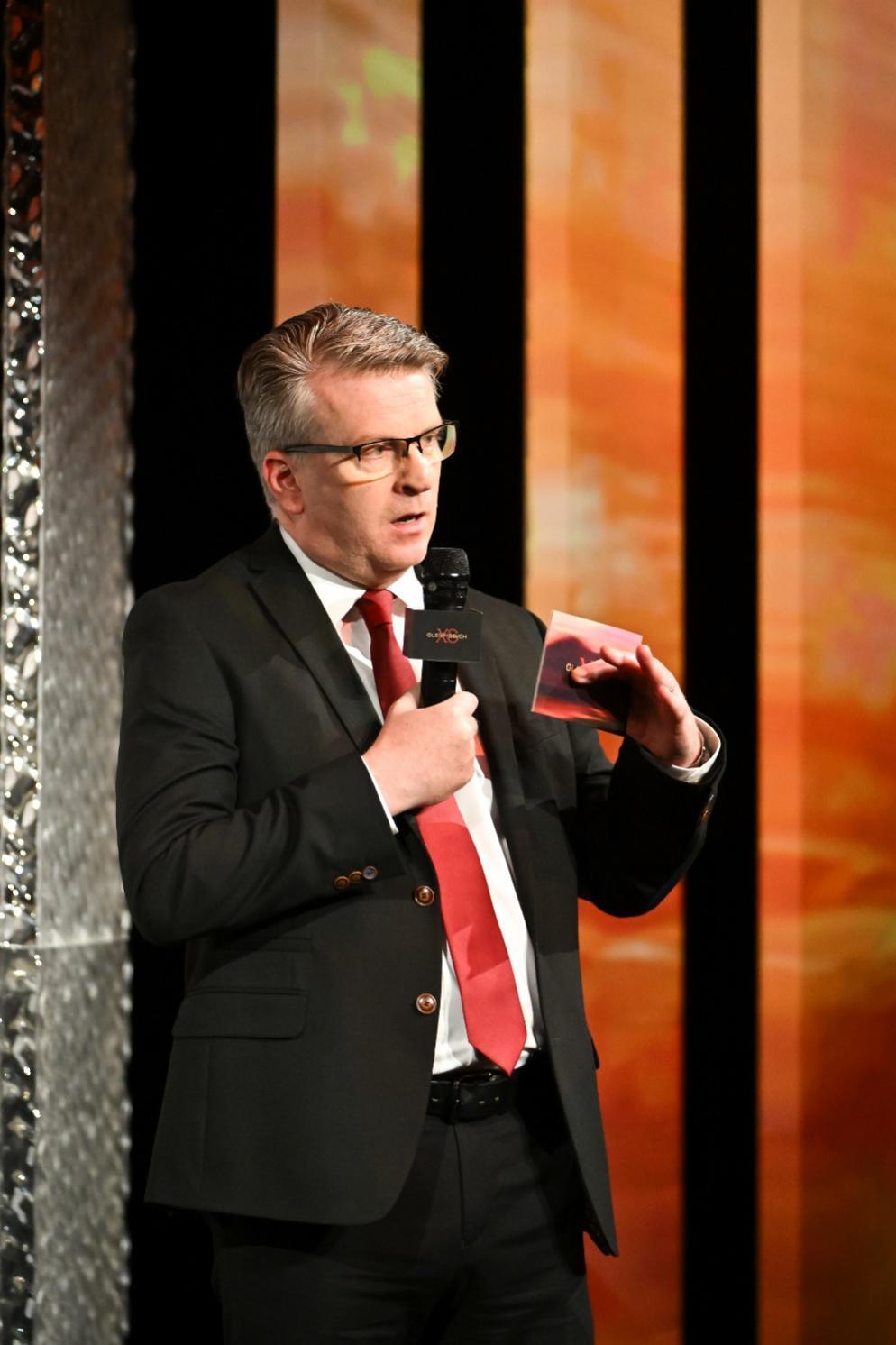 当夜色渐入佳境,真正的华彩乐章于地标奏响。标志性的红色光晕点亮上海展览中心主立面,层层浸染,直至亮起巨大的格兰菲迪徽标。这场恢弘的城市级视觉盛宴,以极具冲击力的方式,向全城宣告格兰菲迪XS系列的耀目问世。