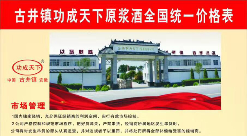 安徽功成天下酒业有限公司“功成天下”系列白酒跟据市场调查、消费水平及购买用途、推出各种档次的白酒产品,功成天下酒现面向全国招商!我们承诺“强劲的广告支持、优厚的经销商政策、为各级代理商提供巨大的利润空间!