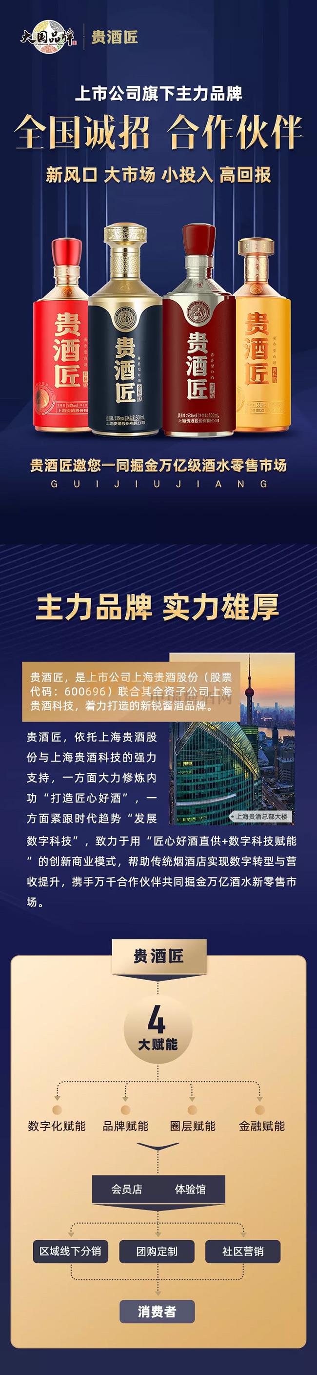 贵酒匠,依托上海贵酒股份与上海贵酒科技的支持,一方面大力修炼内功“打造匠心好酒”,一方面紧跟时代趋势发展“数字科技”,致力于用“匠心好酒直供 数字科技赋能”的创新商业模式,帮助传统烟酒店实现数字转型与营收提升,携手万千合作伙伴共同掘金万亿酒水新零售市场。