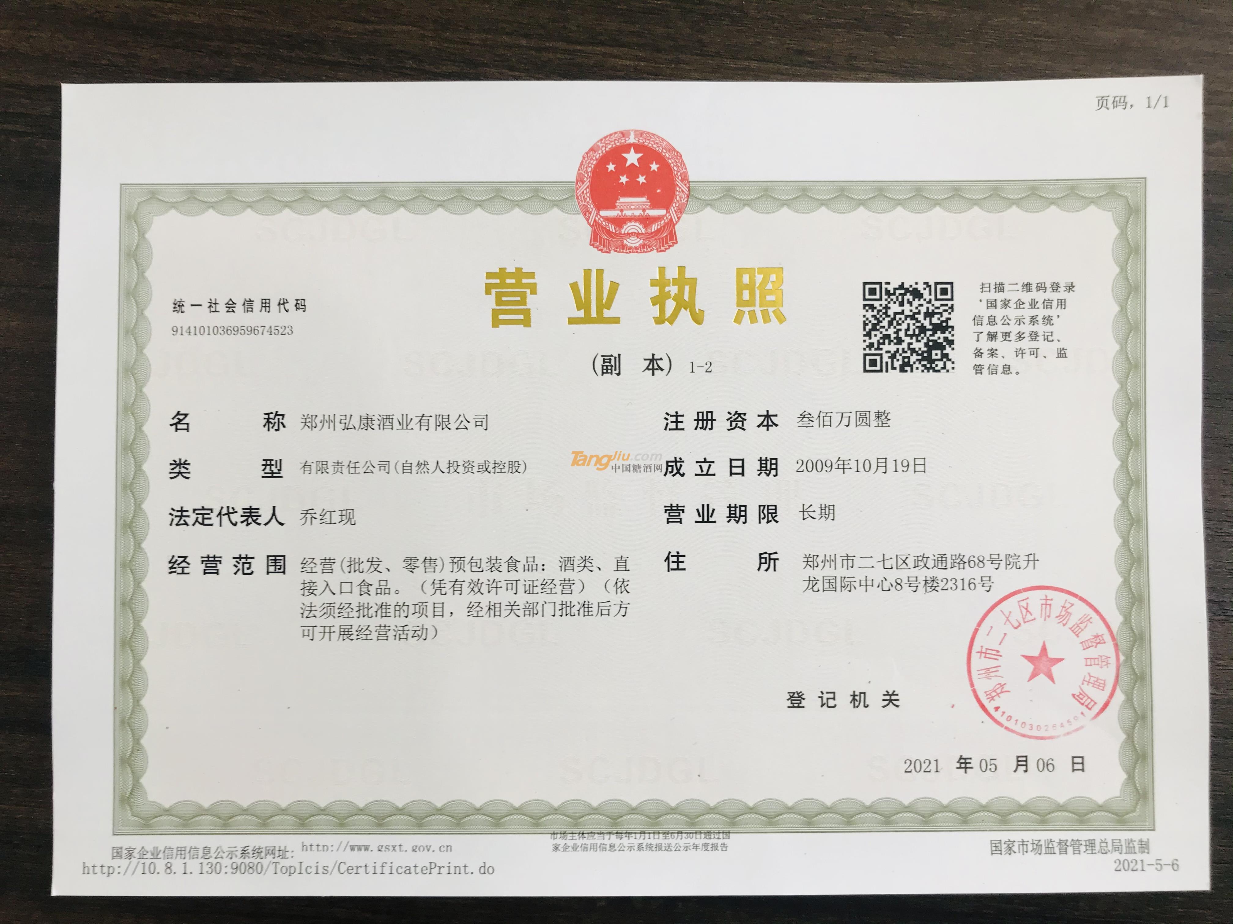 当前位置:糖酒网首页 » 白酒招商 » 郑州弘康酒业有限公司 » 诚信认证