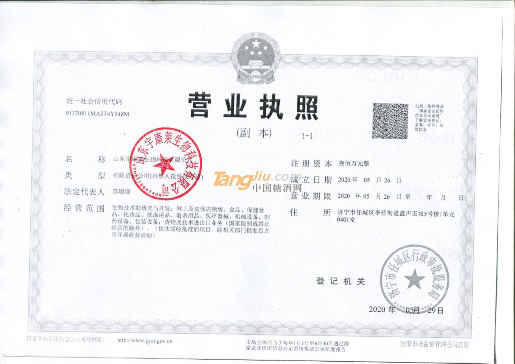 当前位置:糖酒网首页 » 保健食品招商 » 山东宇康莱生物科技有限公司 » 诚信认证